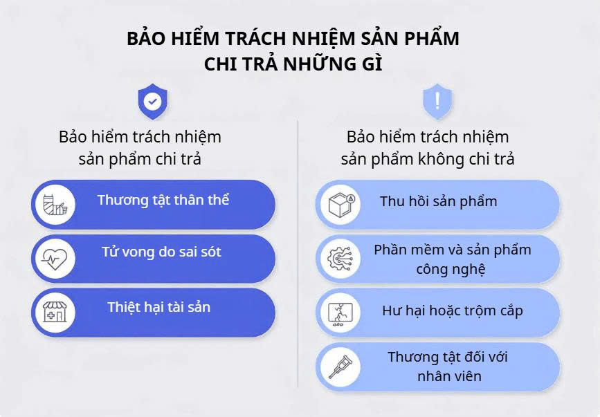 Một  doanh nghiệp  bán sản phẩm cho khách hàng  có thể gặp rủi ro về một sai sót gây ra thương tích hoặc thiệt hại cho tài sản của người khác. Ví dụ: giả sử khi một khách hàng mua một dụng cụ điện do doanh nghiệp đó sản xuất không may có một khuyết tật của sản phẩm  khiến khách hàng bị thương và họ kiện doanh nghiệp của bạn. Khi đó  Bảo hiểm trách nhiệm sản phẩm sẽ giúp bạn chi trả  bạn giúp bảo hiểm: